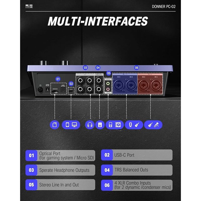 Thanks to dedicated interfaces for dynamic microphones, condenser microphones, musical instruments, and game console optical fiber, PC-02 works well for all contents and creators, the podcasters, the streamers, the room band or musicians, the stand-up comedians, the interviewers, the gaming host and so on.