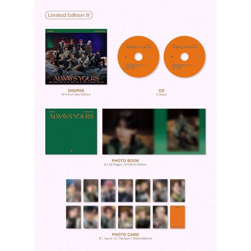 Limited Edition B. Includes 52-page photobook, 1 photocard (1 of 13, randomly enclosed), all in a digipak with original cover. Two CD collection. K-pop powerhouse Seventeen release their Japanese best-of album Always Yours. In celebration of the 5th anniversary of Seventeen's Japan debut, the album contains a total of 27 songs on 2 discs, featuring two new Japanese original songs as well as Japanese versions of the band's Korean hits.