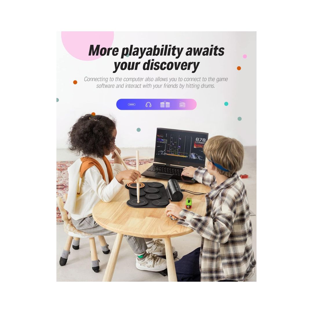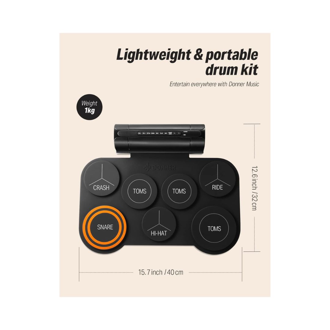 The Donner Electric Drum Pad unleashes musical creativity, offering a portable solution for practice and performance. Ideal for beginners and kids, it serves as both a musical toy and an alternative instrument. With powerful stereo speakers and adjustable volume levels, it enables immersive practice sessions. Crafted from high-quality silicone, it reduces noise and supports headphone output for quieter practice. Complete with essential accessories and free drum lessons, it’s a versatile tool for musicians of all ages, empowering them to practice and perform anywhere.