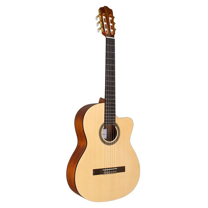 Designed for aspiring classical guitar players, the Protege Series C1M from Cordoba is a full-size, nylon-string classical guitar with a natural, matte polyurethane finish. It utilizes a traditional, classical build with fan bracing, featuring a spruce top with mahogany back and sides. Aesthetics such as a traditional rosette and black ABS binding are also incorporated.