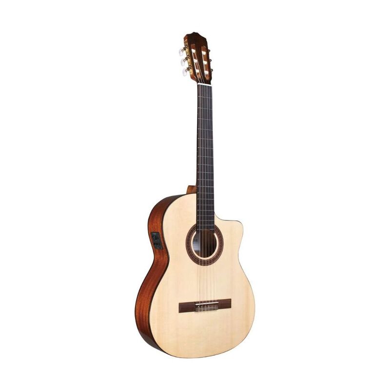 Based on Cordoba’s top-selling C5-CE, the C5-CE Spruce adds a new option to a fan favorite. A soft cutaway provides easy access to the upper register, and a Fishman Presys II preamp amplifies your signal for stage and studio. Perfect as a first nylon-string guitar and ready for gigging, this lightweight model is built with a solid Engelmann spruce top and mahogany back and sides to produce a clear, powerful tone with beautiful sustain. Handmade in the traditional Spanish style, the C5’s carved headstock, hand-inlaid wood rosette, Indian rosewood binding, Savarez strings, and glossy PU finish result in a guitar that truly stands out from all other entry-level options. A lightweight adjustable truss rod is built into the neck for stability. Available in Natural finish with solid Engelmann Spruce top.