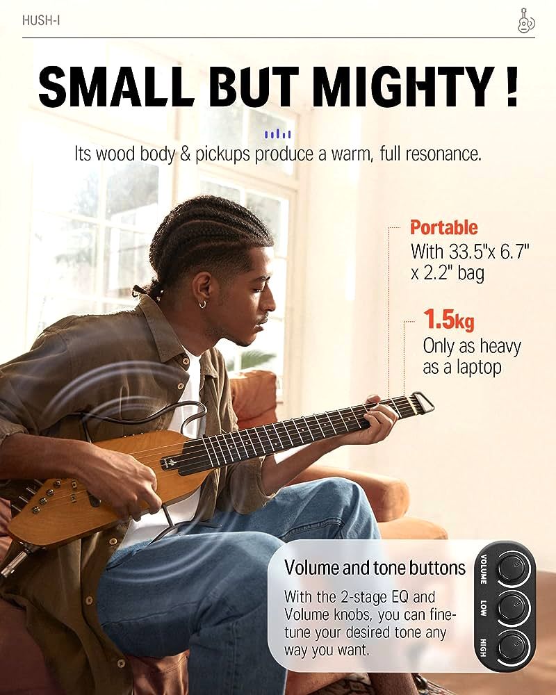 The ultra-compact and lightweight Donner HUSH-I Guitar is the perfect axe for travel and practice. Although being a full-scale guitar, it features a headless and detachable bar-frame design for extreme compaction and quietness with the least amount of wood. The onboard Donner custom-designed piezo pickup and preamp deliver you the ideal tone over the unplugged quietness via headphones and traditional cable output while also giving you full tone control with the “Volume”, “High”, and “Low” Knobs. The onboard “Phase” button also guarantees you stability in live venues. Play beyond the limits.