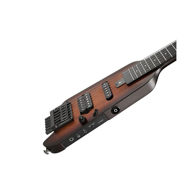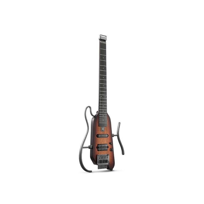 The HUSH-X electric guitar weighs only 4.4 pounds and features a headless portable design, making it half the volume of a traditional electric guitar. Its compact size allows the gig bag to fit in an airplane overhead bin, ensuring you can take your music anywhere you go.