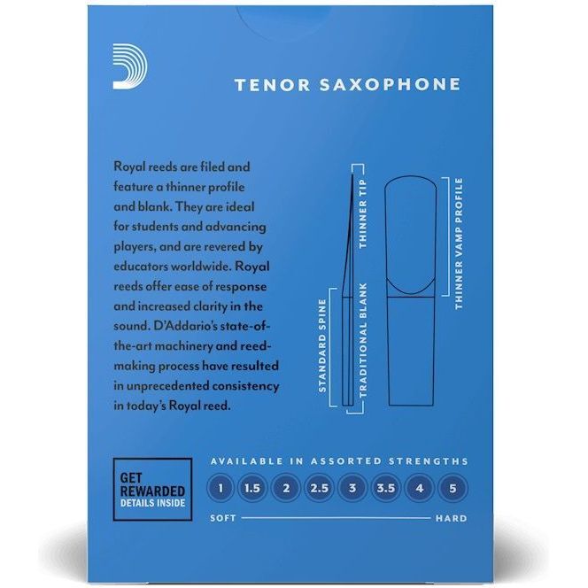 Players around the world trust D'Addario to produce solid, reliable reeds at an accessible cost. Royal Reeds are the next generation of woodwind reeds intended for the newest generation of students. They come with a traditional blank shape and profile for the comfortable feel and easy, balanced response that beginners and advancing players can rely on. Royal reeds also feature a filed cut for an extra helping of tonal clarity. Thanks to D'Addario's state-of-the-art manufacturing process, Royal reeds have a consistent feel from pack to pack — which means you can trust that your instrument will sound its best every time you change your reed. We recommends Royal reeds for players who are serious about their sound and need consistent results in practices and performances.