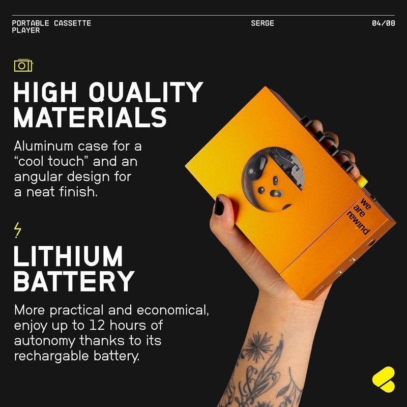 The We Are Rewind cassette player and recorder is made with quality materials for a premium feel and lasting durability. The heavy-duty aluminum casing and built-in rechargeable battery add to the overall quality and portability.