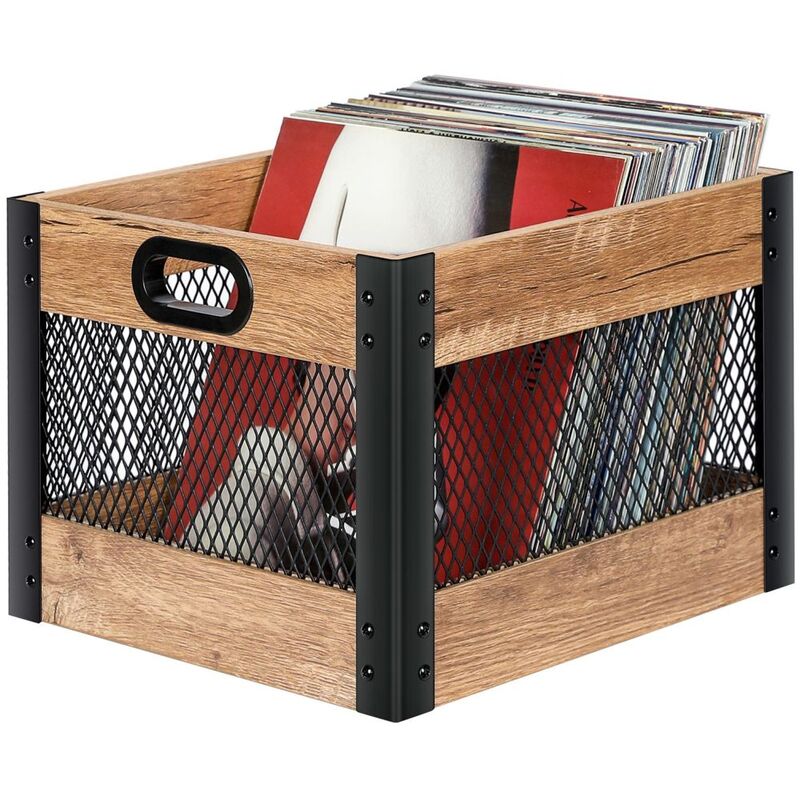 It can easily display up to 65 vinyls upright. The Record Crate has comfortable handles, so it can be moved easily. Premium material, exquisite metal wood with strong wires. Bold and hardened metal grid panel with black plastic coating making it very sturdy, durable and easy to install.