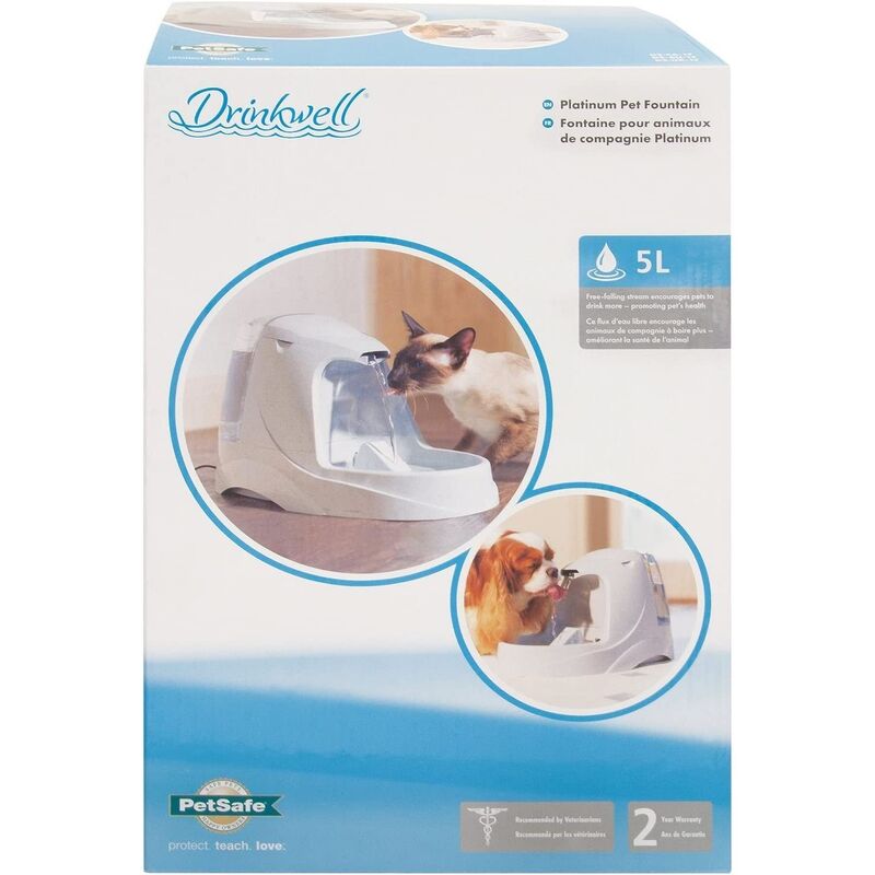 The DrinkwellPlatinum Pet Fountain is the ultimate in style and design. This all new design utilizes the same patented free-falling stream of water as the original Drinkwellwhich entices pets to drink more, keeping them happy, healthy, and hydrated. The Platinum features a new snap on lid to prevent accidental removal, a pre-filter to catch large particles before they reach the motor, and a newsubmersible pumpfor nearly silent operation.Why is running water so important?Researchshows that one of the best ways to improve your pet's health is to get them to drink more water, and the best way to do that is with the DrinkwellPlatinum Pet Fountain. By using a patented free-falling stream of water, the pet fountain continually aerates your pet's water with healthful oxygen. An extra large charcoal filter removes bad tastes and odours, giving your pet the best possible, and most appealing, way to stay hydrated!Water capacity: 5 litresDishwasher safePre-filter catches hair and other large particles before they reach the motorPatented free-falling water stream entices pets to drink more waterReceiving ramp reduces splash of falling waterAdjustable flow controlLow-voltage, 12 V systemSubmersible pumpfor nearly silent operationSnap-on lid to prevent accidental removalRubber feet to prevent slidingReplaceable charcoal filter removes bad tastes and odours