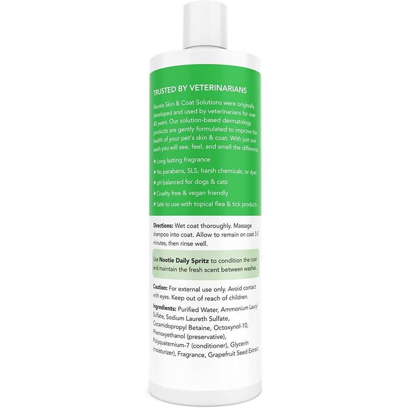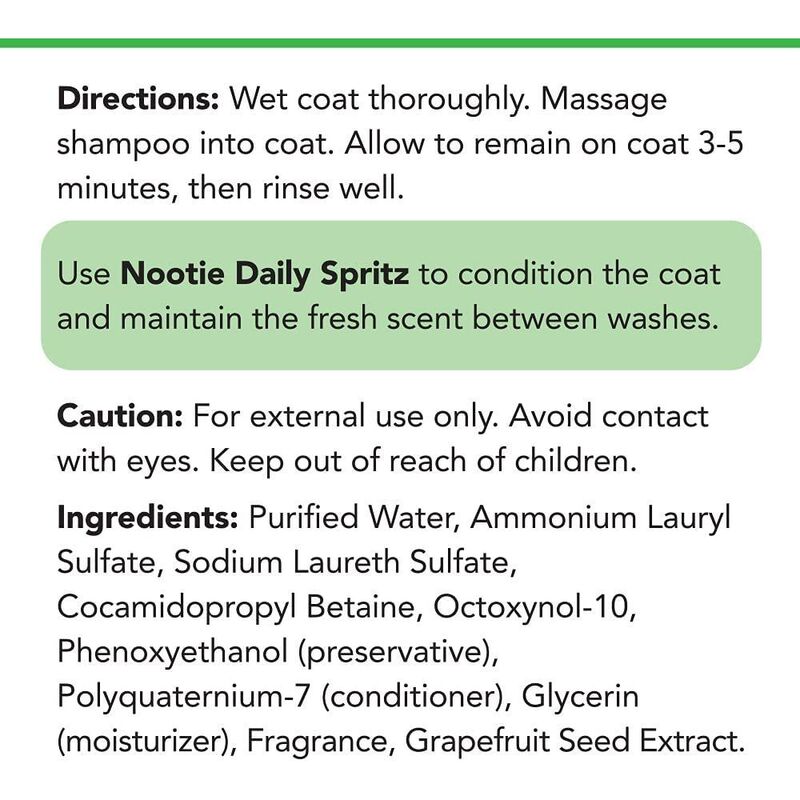 A great moisturizing grooming shampoofor pets. Vitamin and oil enriched to give coats a shiny and soft texture, this shampoo also leaves a long lasting delicious scent that's unforgettable.Hypo-Allergenic & Germ Fighting - Nootie uses an all natural Grapefruit seed extract to fight germs, bacteria and more! This hypo-allergenic, tearless formula, lightly scented with Coconut Lime Verbena, cleanses your pet while nourishing their skin & coat. It is made with natural ingredients and is soap and parabenfree.- Long lasting fragrance- Made with natural ingredients- Soap & parabenfree- No sulfates or harsh chemicals- Safe to use along with topical flea & tickproductsIngredientsPurified Water, Tearless Shampoo Base, Polyquat 7 (Conditioner), infused with essence of Coconut Lime Verbena, Grapefruit Seed Extract (all natural), Preservative16 oz