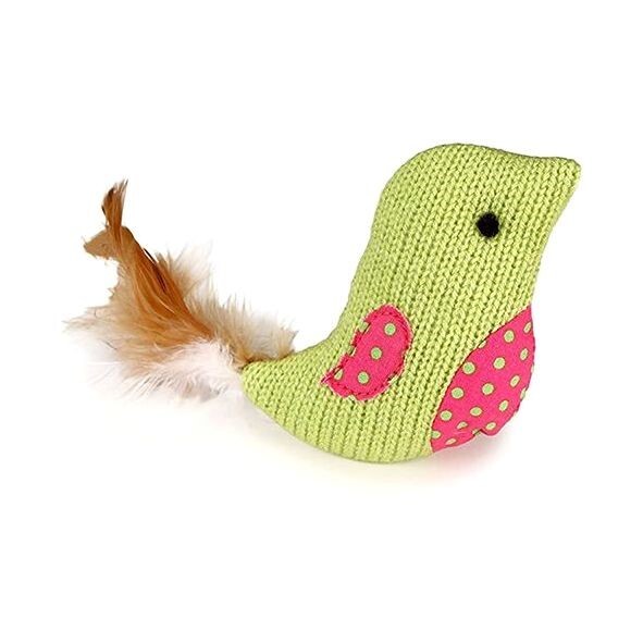 SmartyKat Feather Flock! This cute little birdie not only has feathers to stimulate your cat, but sings and chirps with realistic birdsong.