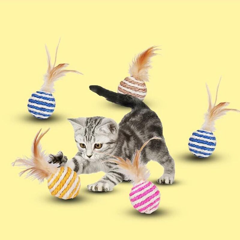 The Wild Catz Rowdy Balls Cat Toy is crafted from durable sisal and features a textured surface ideal for scratching and batting. This playful toy stimulates your cat’s natural instincts, offering both interactive fun and exercise. Each set includes four sisal balls with feathers in various colors. These balls have built-in gravels that make noise to engage your cat's senses. Handmade from high-quality, natural sisal hemp, they are wear-resistant and safe for your cat. Measuring approximately 5 cm in diameter, they are perfect for all cats and make an entertaining gift.