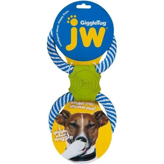 I giggle when I wiggle! Perfect for a game of fetch or tug-o-war, the JW Giggle Tug features two strong loops of rope that are connected by a durable rubber piece that "giggles" when tugged on or shaken about. Perfect for multi-dog households, the Giggle Tug makes playtime fun again and keeps dogs engaged, active, and coming back for more. Loop one rope around a doorknob for solo play, or hold onto one end for a spirited game of tug of war with your best friend.