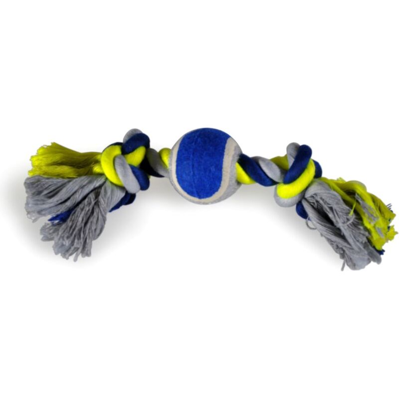 Measuring approximately 26cm in length, this toy features a vibrant blue and yellow color scheme that adds visual appeal and makes it easy to spot during play. The design includes a tennis ball securely attached to the cotton rope, creating a versatile toy that combines fetching and tugging activities.