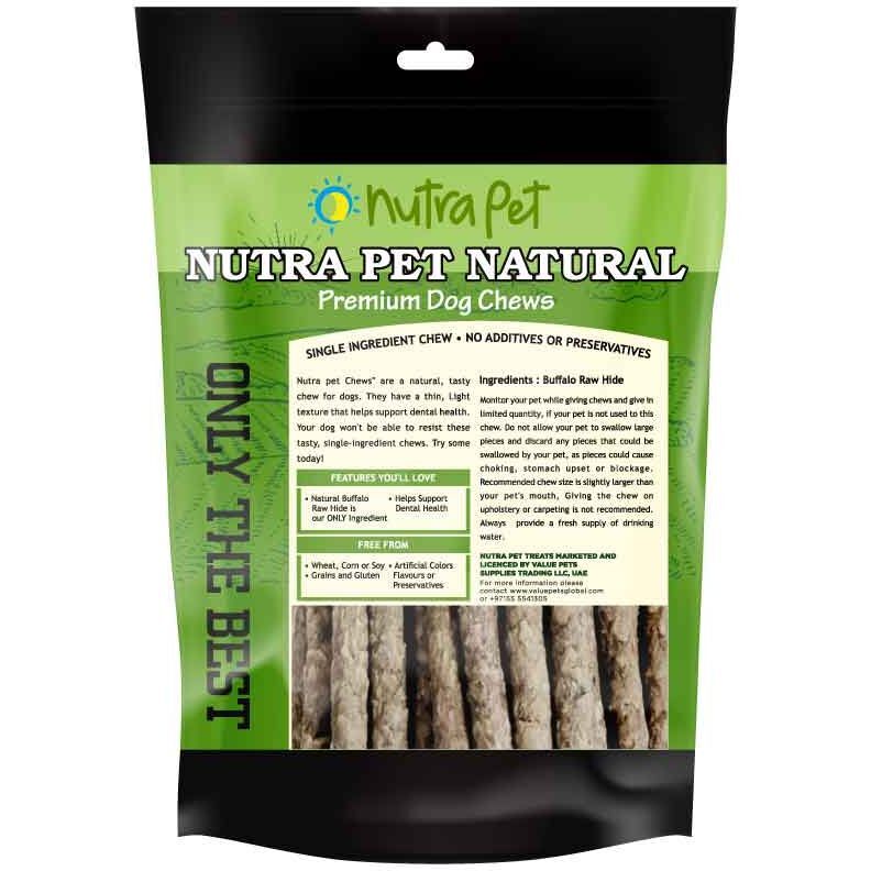 Nutra Pet chews are a natural, tasty chew for dogs. They have a thin, Light texture that helps support dental health. Your dog won’t be able to resist these tasty single- ingredient chews. Try some today! Monitor your pet while giving chews and give in limited quantity, if your pet is not used to this chew, do not allow your pet, as pieces could cause choking, stomach upset or blockage. Recommended chew size is slightly larger than your pet’s mouth, Giving the chew on upholstery or carpeting is not recommended. Always provide a fresh supply of drinking water.