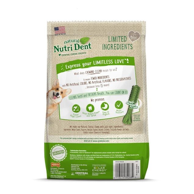 Cleaning your dog's teeth takes commitment. Why not let him help? Our Nutri Dent Limited Ingredients Dental Chew Treats naturally freshen your dog's breath and clean his teeth with 360 degree scrubbing nubs and only 8 simple ingredients. They are easy to digest, promote your dog's wellbeing with natural ingredients, and contain no artificial colors, flavors, or preservatives. They clean like a brush and taste like a treat!