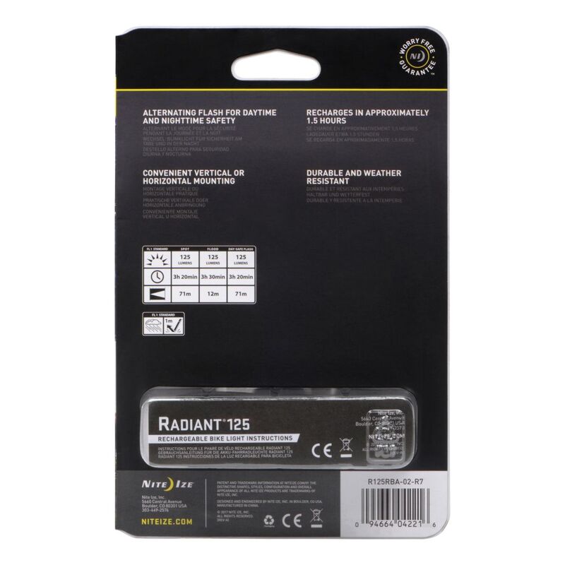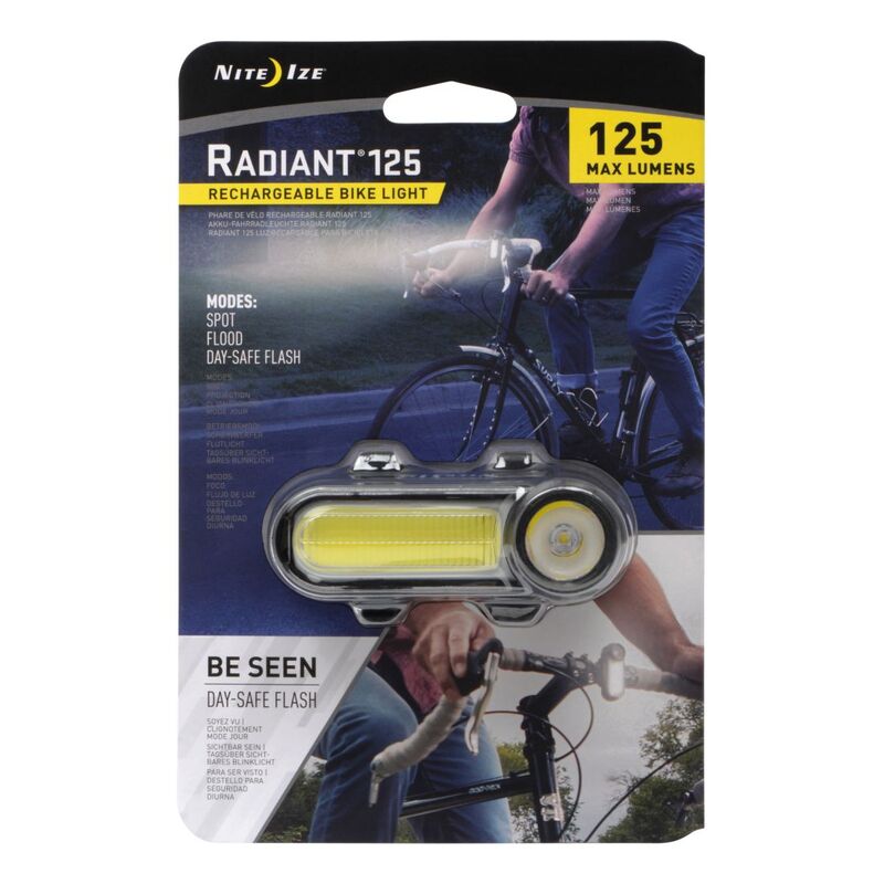 Ready your ride for evening exercise with this Nite Ize Radiant 125 rechargeable bike light. The simple design and stretchy attachment bands support tool-free installation, while the USB-rechargeable lithium-ion battery delivers extended run times to keep your path illuminated. A 125-lumen LED offers bright illumination for dusk, dawn and nighttime bike rides. This Nite Ize Radiant 125 rechargeable bike light features spot, flood and day-safe flash modes to help you stay visible on roads, trails and bike paths.