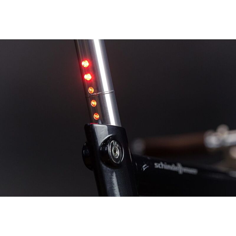 LightSKIN is a combination of a seat post and tail light. The new model is road legal in Germany according to StVZO standards. The LightSKIN seat post has five bright, glare-free LED lights making you visible from all sides. The two LEDs at the bottom can be lowered into the seat tube, depending on your height and frame size. Durable, weatherproof, anti-theft. Julet micro cable included