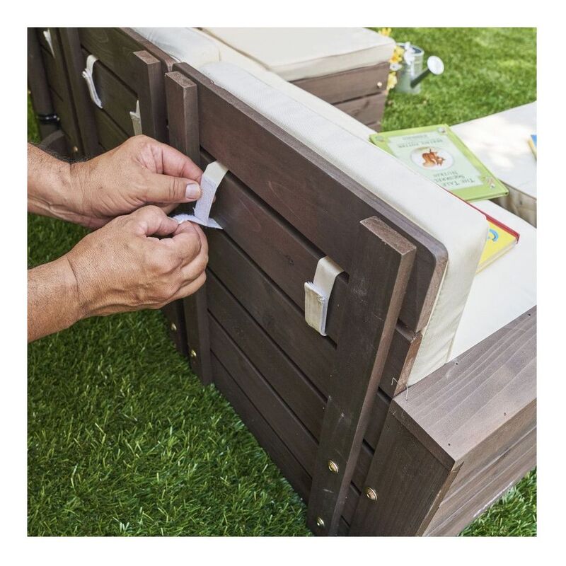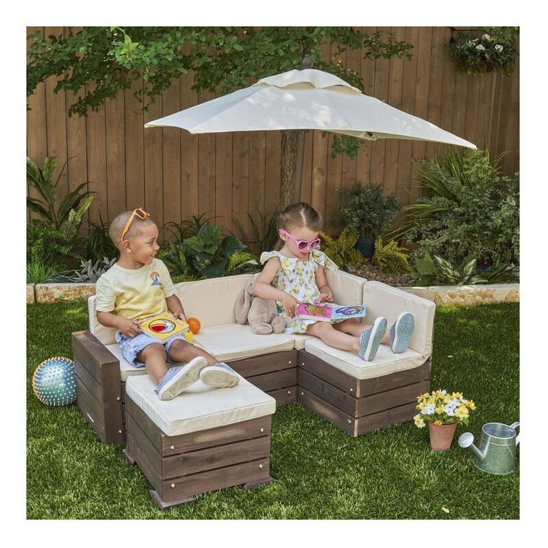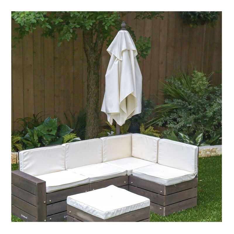 Adorable KidKraft Outdoor Sectional Ottoman & Umbrella Set will have the adults envious of the kids' patio relaxation area. The sofa sectional provides ample space for multiple kids to stretch out and enjoy being outdoors. Use the included ottoman as a table for snacks or push right up to the sectional to provide even more lounging room. An attached umbrella is perfect for deflecting some sun. The outdoor-quality cushions are a comfy spot to cozy up to read a book, watch an outdoor movie or play with toys. Modern wood stains and canvas colors will complement your existing patio furniture nicely.