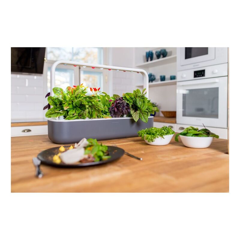 The Click & Grow Smart Garden 9 is an innovative indoor garden that grows fresh fruits, vegetables, herbs, salads and flowers completely effortlessly. It incorporates full-spectrum LED grow lights, automatically measures the optimal level of water and light needed for plants and makes sure plants have enough nutrients and oxygen via the unique patented growth-material Smart Soil, that keeps the levels of oxygen, water, pH and nutritional ingredients at an optimal level for each plant.