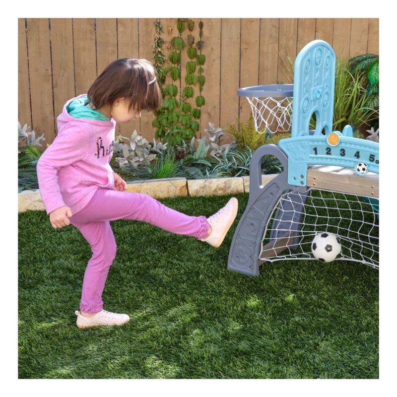 - Comes with 3 junior-sized balls: soccer, basketball and baseball