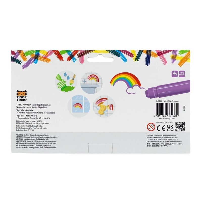 • A rainbow of twelve coloured, Mini Silk Crayons