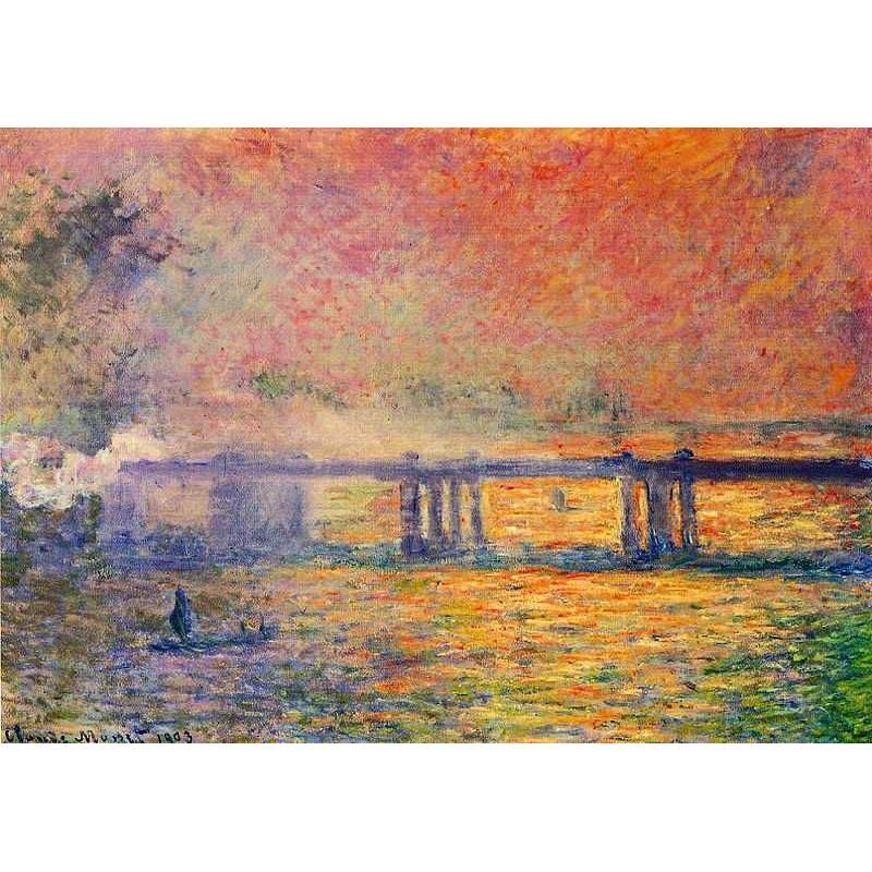 Claude Monet’s "Charing Cross Bridge,” depicts a bustling London scene with soft colours and reflections on the Thames River. The painting captures the lively atmosphere and changing light of the city.