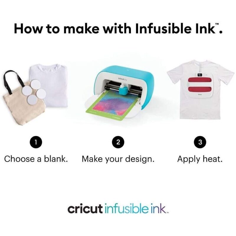 - Apply heat. Infuse your design into your Cricut blank with Cricut EasyPress The Infusible Ink system includes Infusible Ink Transfer Sheets in a variety of solid colors and patterns, as well as Infusible Ink Pens & Markers. Plus a growing list of compatible Infusible Ink blanks, including T-shirts, tote bags, and coasters.