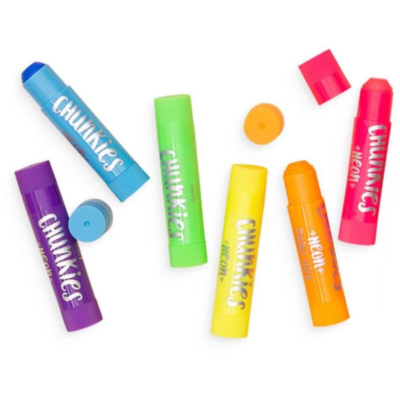 A neon set of Chunkies Paint Sticks in a travel-friendly pack of 6! These bright neon paint sticks are easy to hold and come in 6 outstanding neon quick drying colors. You twist up the barrels for long-lasting, mess-free fun that kids and adults alike will love. When you want to paint colorful pictures but want to leave the mess behind then it's time to reach for Chunkies Paint Sticks. These neon paint sticks are super easy to use, clean and portable because they're like painting with a crayon. Just uncap, twist and start painting. Chunkies neon are a set of 6 brilliantly colored paint sticks each in a thick barreled casing so they're easy for little hands to hold. The paint colors dry quickly and won't smudge, but it's easy to mix colors to make even more colors. It's magic!