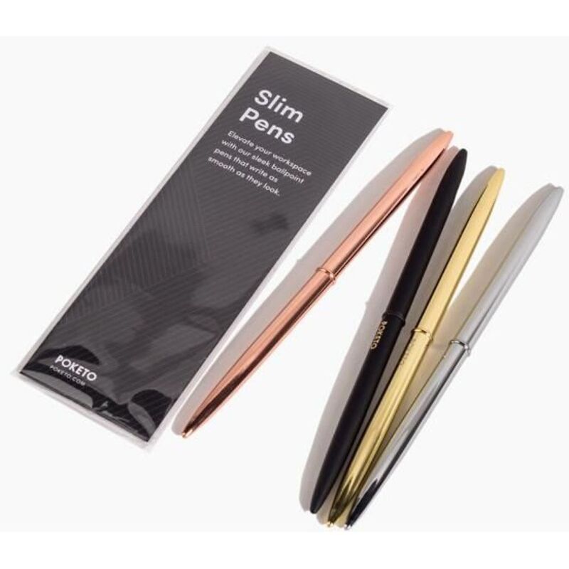 These Sleek ballpoint pens write as smoothly as they look. They have a long and lean shape and weighty feel that sits great in your hand. Three come in metallic finishes and one in matte black to elevate your workspace.