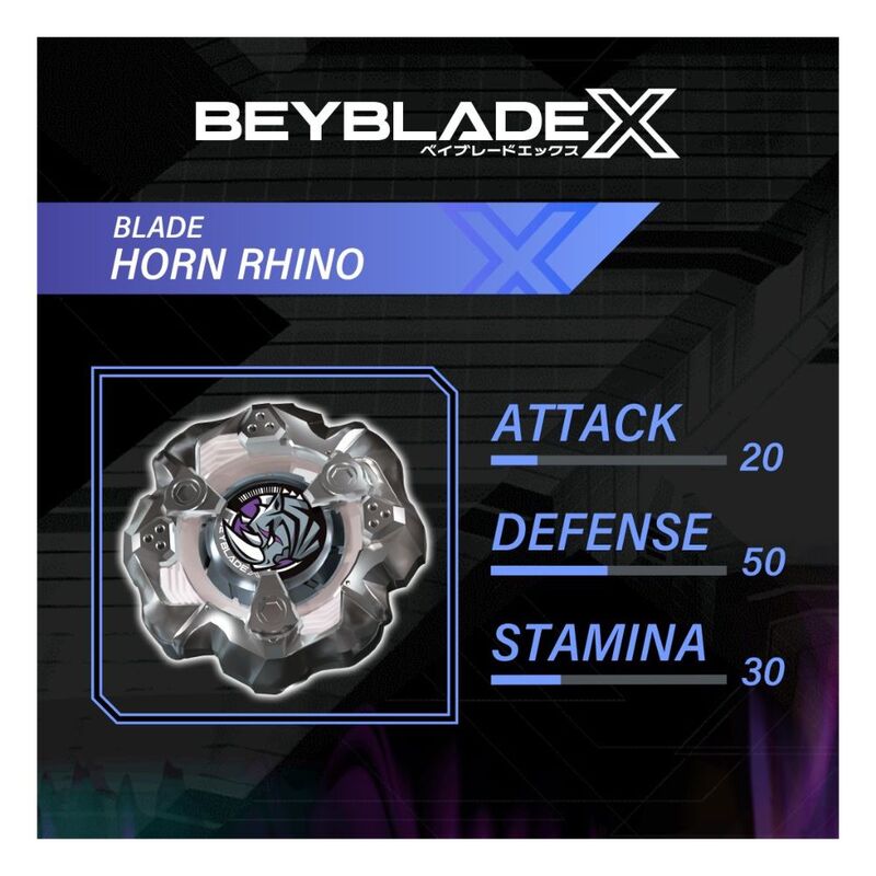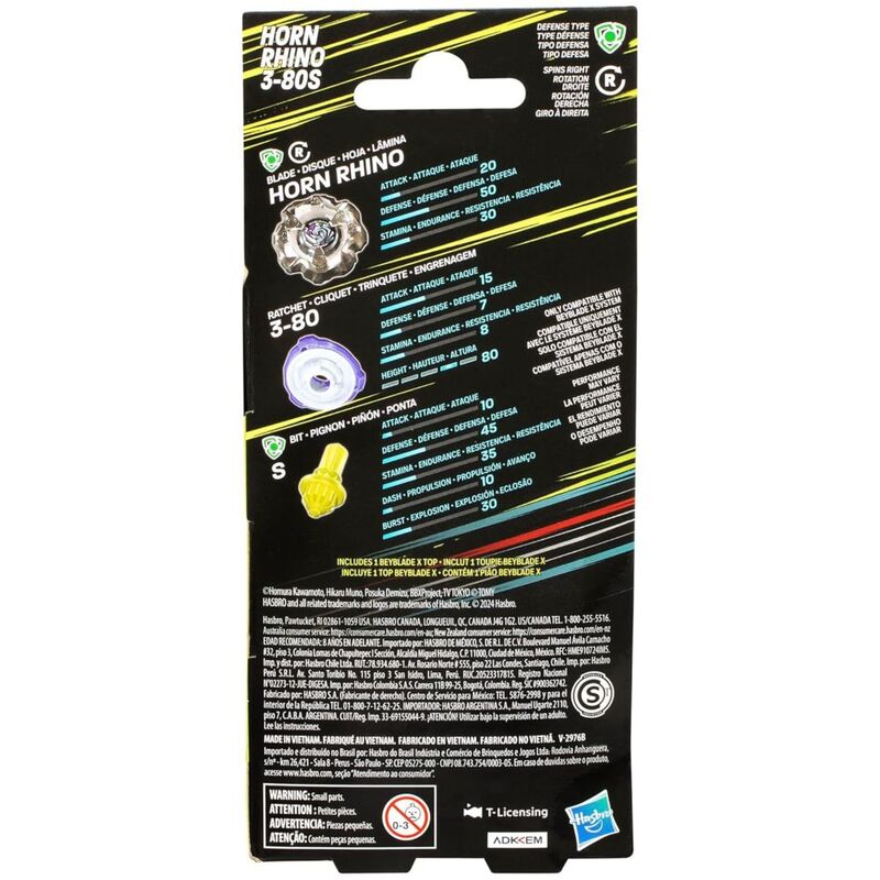 Introducing the Horn Rhino 3-80S, the ultimate BEYBLADE X Defense-Type top designed for Bladers who want to enhance their defensive gameplay! With its robust build and strategic design, this top is engineered to absorb impacts and outlast opponents, making it a must-have in your collection!