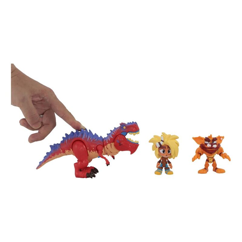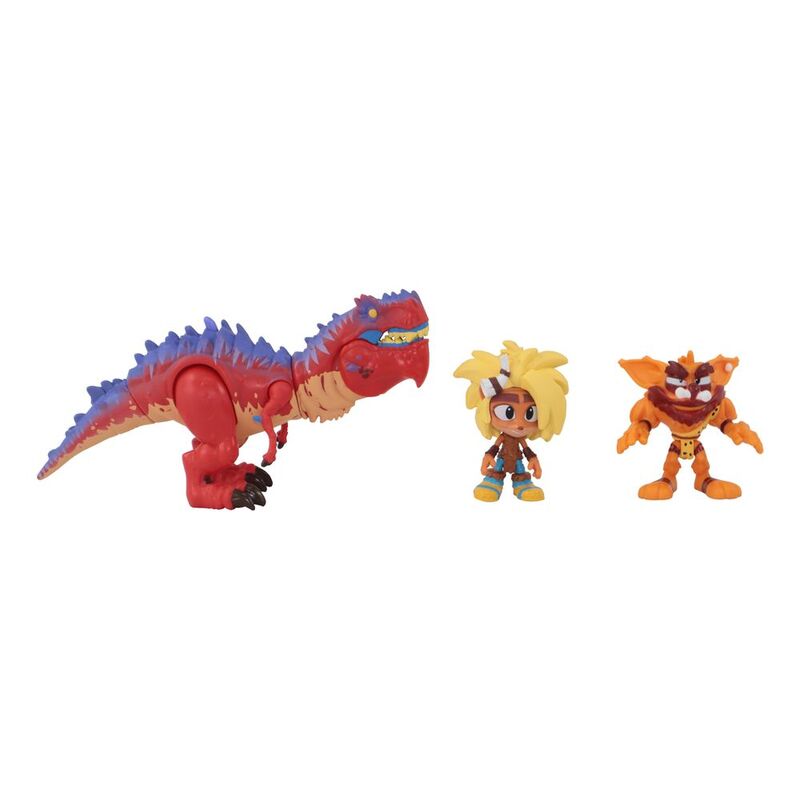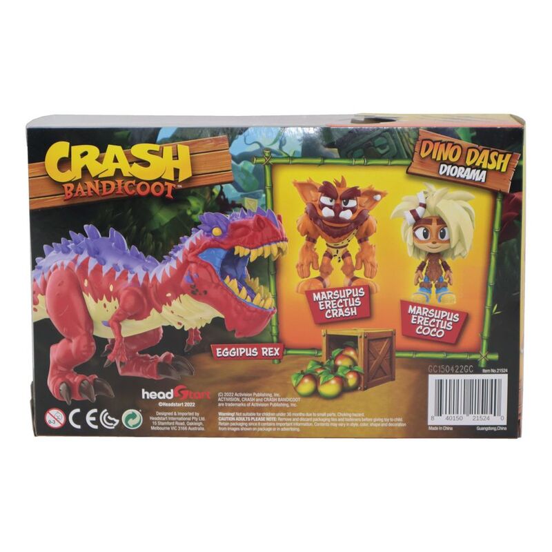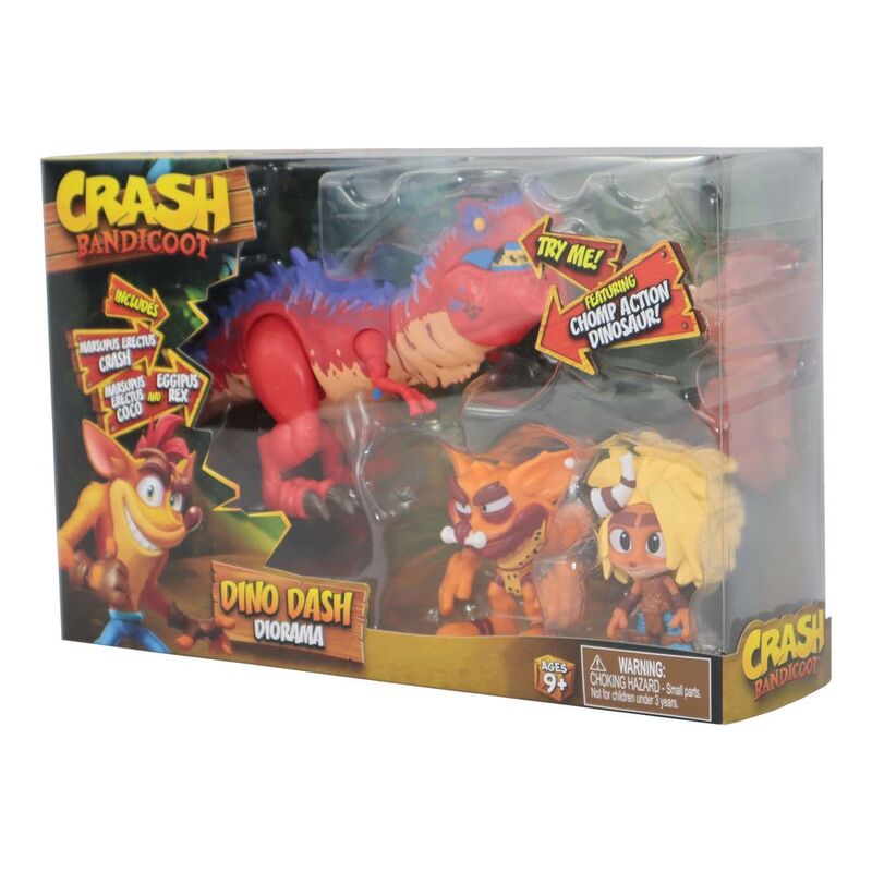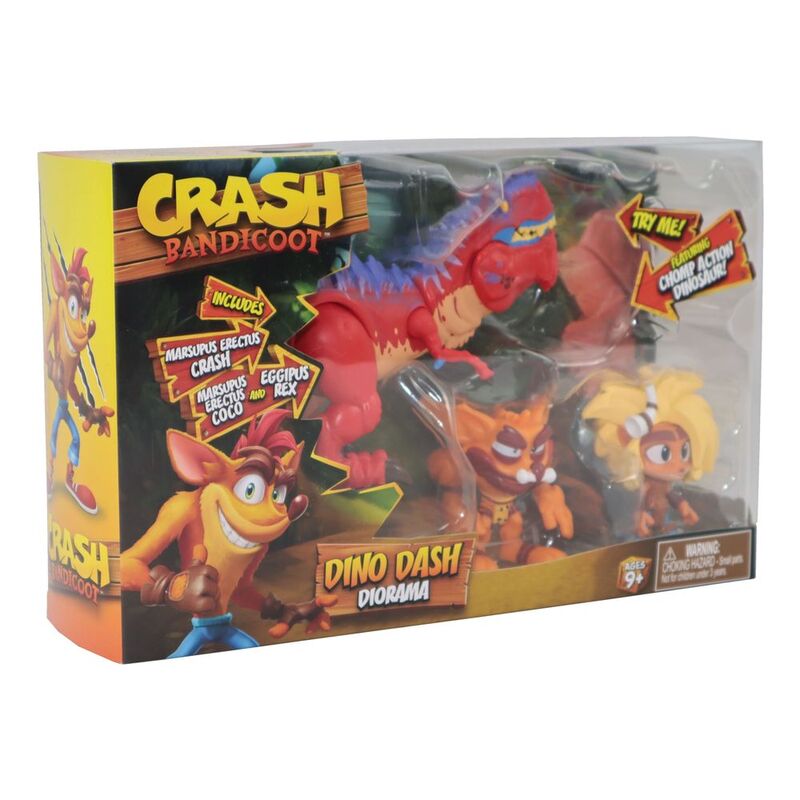 Recreate your favorite Crash Bandicoot scenes with this awesome HeadStart Dino Dash set! Help Crash and Coco try to escape the dinosaur with bite-attack action! Contains two 2.5-inch figures and a 7.5-inch dinosaur for your own storytelling fun based on the video game. Plus, this diorama is great for displaying in your favorite spot!