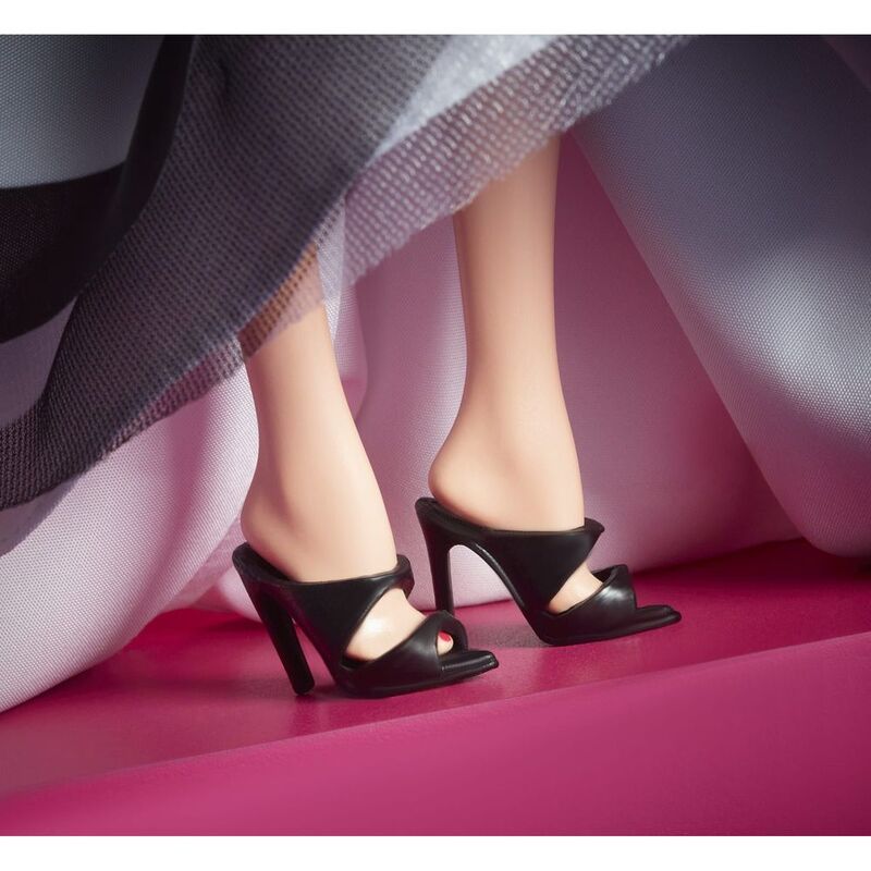 - She wears a black and white gown inspired by the swimsuit that the original Barbie doll wore. A fitted sweetheart bodice blooms into a voluminous striped skirt.