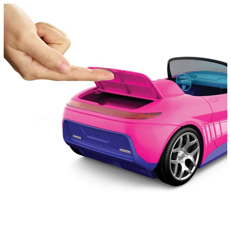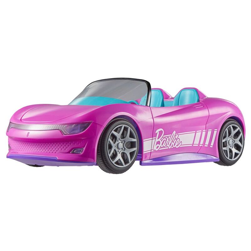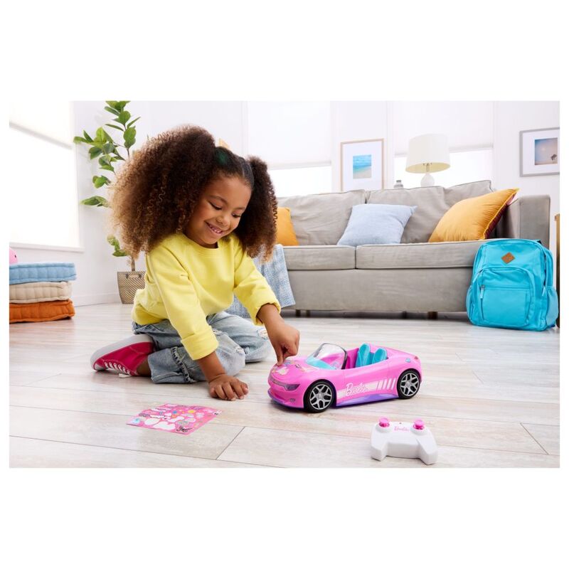 Hop into the Hot Wheels RC Barbie Convertible for an epic road trip! This super cute and signature pink remote-control car fits two Barbie dolls and has room in the trunk for storing important road-tripping accessories. It also includes a sheet of stickers to add personal style to the car's look! Choose from two driving modes story and speeder to adjust to different terrains and vibes. Dolls and accessories sold separately. Colors and decorations may vary.
