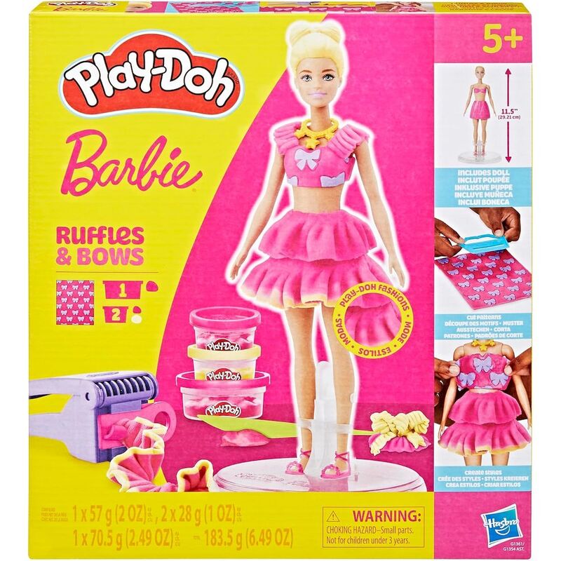 Create super cute styles with the Ruffles and Bows set! It's easy and fun to make Play-Doh Barbie doll clothing with this arts and crafts kit. Just place the doll on the stand, use the Play-Doh Pattern sheet and cutters to cut Barbie dresses, and dress her up in the most creative ways imaginable. Give her different Play-Doh hairstyles with the hair mold or kids can make their own by hand. Add Barbie doll accessories like a purse and shoes to complete her look. Keep the imaginative play going with 2 cans of Play-Doh modeling compound to add even more details. Give a fabulously fashionable gift for kids who love Barbie playsets and Play-Doh toys!