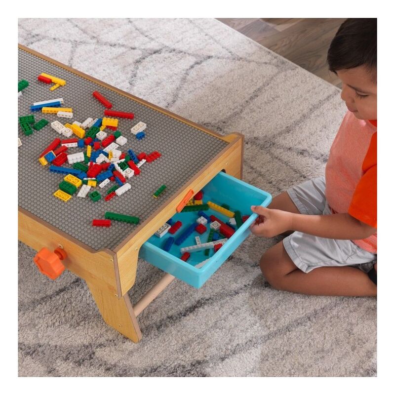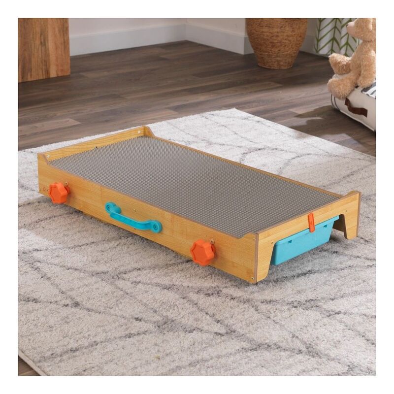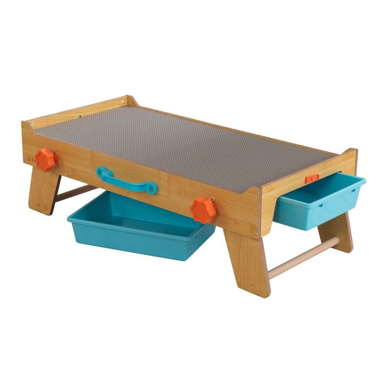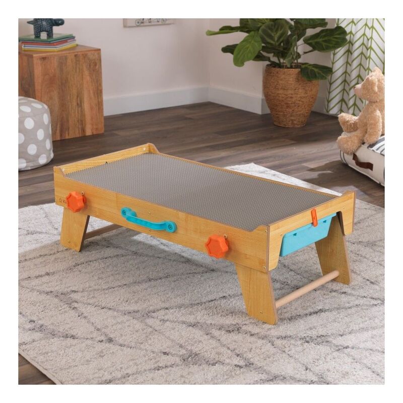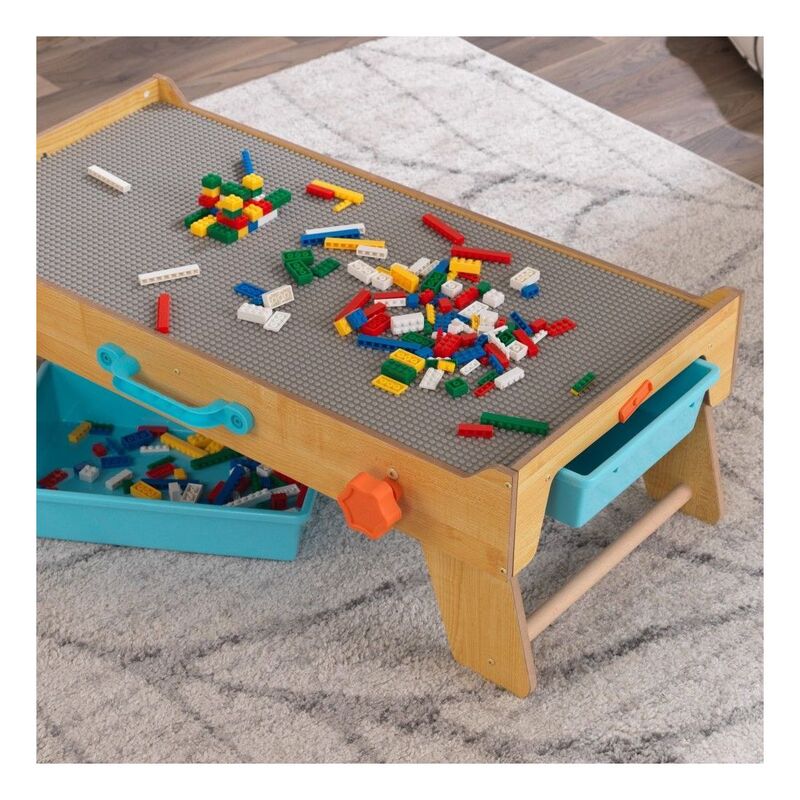 The legs fold open and angle out for stability. The large 360-degree play surface is perfect for multiple kids to build fantastical designs with bricks or blocks. Keep the small pieces in the two storage bins that slide out from the sides. When playtime is over, you can hide the entire table by folding the legs back under, grasping the handle and carrying it off, out of sight. When folded, it's slim enough to fit in small spaces.