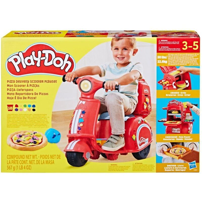 Beep beep - here comes the Play-Doh Pizza Delivery Scooter! It's not just a scooter for kids ages 3-5, it's also a Play-Doh pizza toy that lets them make and deliver their own kitchen creations on wheels. The stamp and spin action in the toy oven at the back of the scooter makes it fun to make pretend pizza creations again and again. Box them up and put them in the slot on the side of the scooter for delivery, then sound the horn when it arrives! This unique imagination toy inspires even more kids pretend play with 10 modeling compound colors in 2 ounce cans and 16 pretend kitchen accessories to create and share Play-Doh pizzas, pretend ice cream treats, and more. It's a fun kids food playset that makes a great gift for girls and boys 3-5 to get their imaginations rolling.