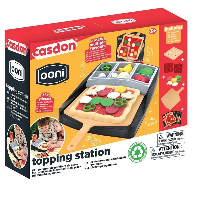 • Includes: Topping Station, Ooni Pizza Peel, 4-slice square pizza, 6x toppings: mozzarella, pepperoni, basil, pepper, pineapple, mushroom (4 of each), 4 pieces of removable sauce layers, 3x pizza topping recipe cards.