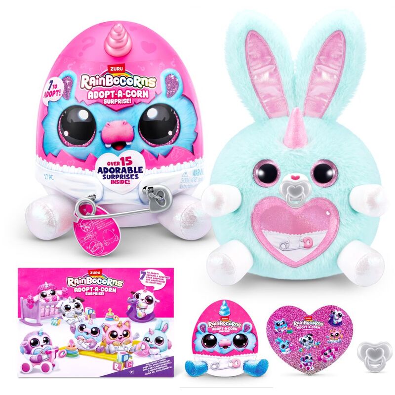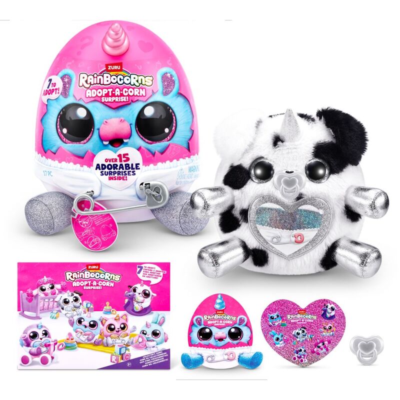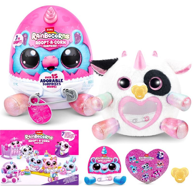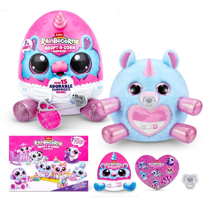 Adopt a brand-new bestie with all-new Adopt-A-Corns! The cutest little baby Rainbocorns are crawling around Rainboville and are in need for your love and care! Unclip your Adopt-A-Corn out of its diaper for adventurous fun and clip back once it's time for some rest. Don't forget about the pacifier! There are 7 Adopt-A-Corns to adopt. Each egg comes with over 15 adorable surprises inside!