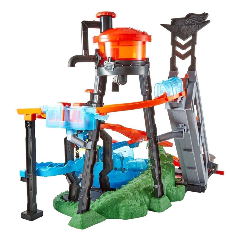 - Set includes a manual crank elevator, crazy track, water tower, whirlpool dunk tank, and 1 Color Shifters car.