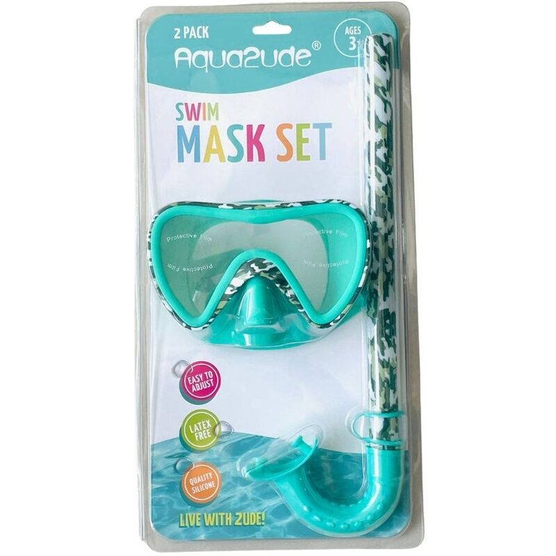 Gear up for underwater adventures with the Aqua2ude Camo Mask and Snorkel Set in bold green! Featuring a rugged camouflage design, this set is made for little thrill-seekers who love to explore the deep! Crafted from soft, latex-free silicone, it's comfortable enough for all-day wear and tough enough for endless fun. The adjustable mask strap ensures a snug fit for kids ages 3 and up, making it perfect for beach outings, pool play, or their first snorkeling experience. Dive in with confidence and camouflage!