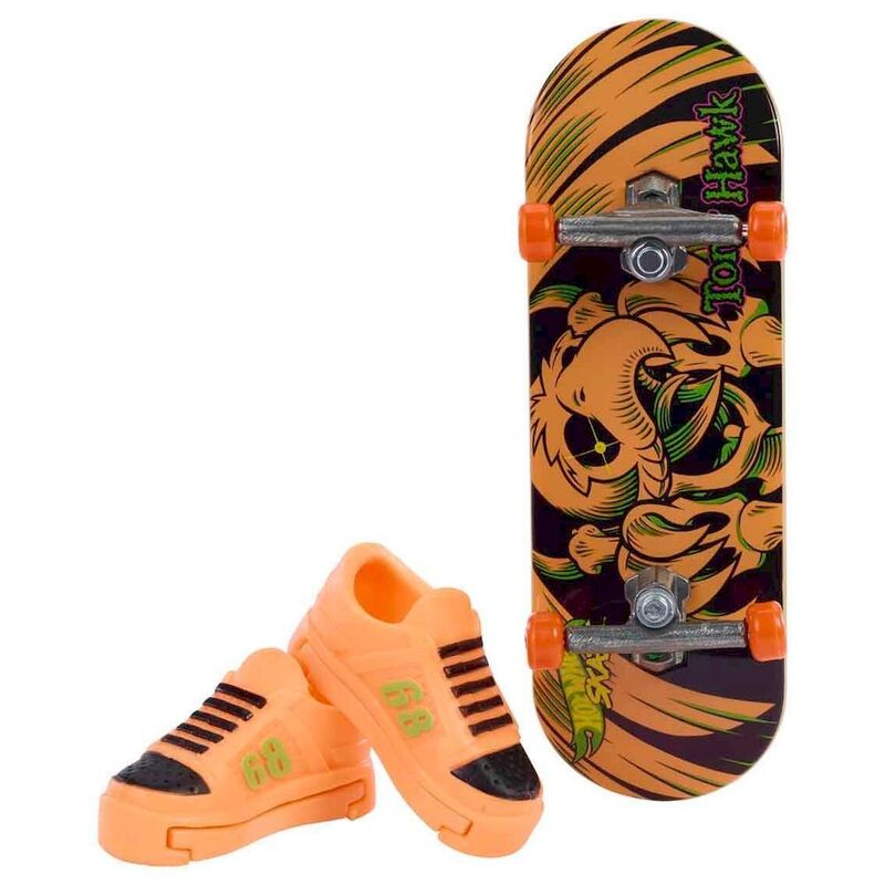 Hot Wheels Fingerboard Skateboard and Shoes Tony Hawk Neon Bones Theme. Hot Wheels and Tony Hawk have teamed up to design a cool new fingerboard. Tony Hawk's original skeleton design has been transformed into a colorful fluorescent art piece. It comes with both the fingerboard and the iconic Hot Wheels shoes.