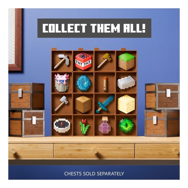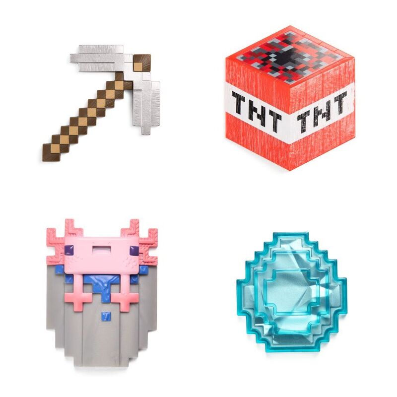 Minecraft Inventory Chest – CavesThis Minecraft Inventory Chest from Series One: Biome Discoveries explores the Caves biome and features Iron Pickaxe, TNT, Bucket of Axolotl & Diamond.