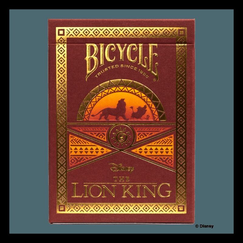 Become the king of game night with Disney Lion King Inspired Playing Cards by Bicycle! Shimmering cold-foil ignites the tuck, card faces and card backs to shine like the savannah sunset, while the legendary lions of Pride Rock grace the court cards with their real elegance. You'll have no worries with the Hakuna Matata ace of Spades in your hand!