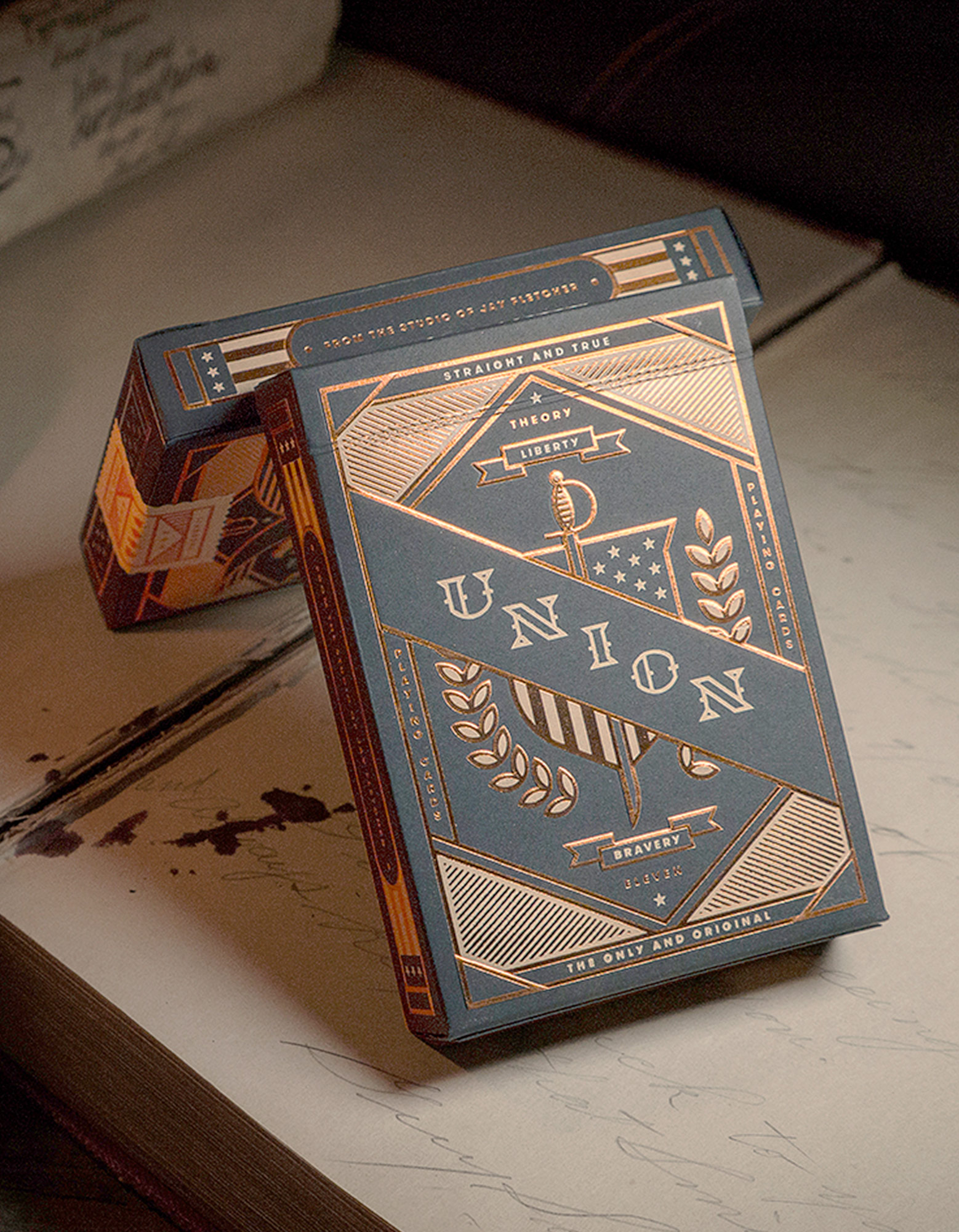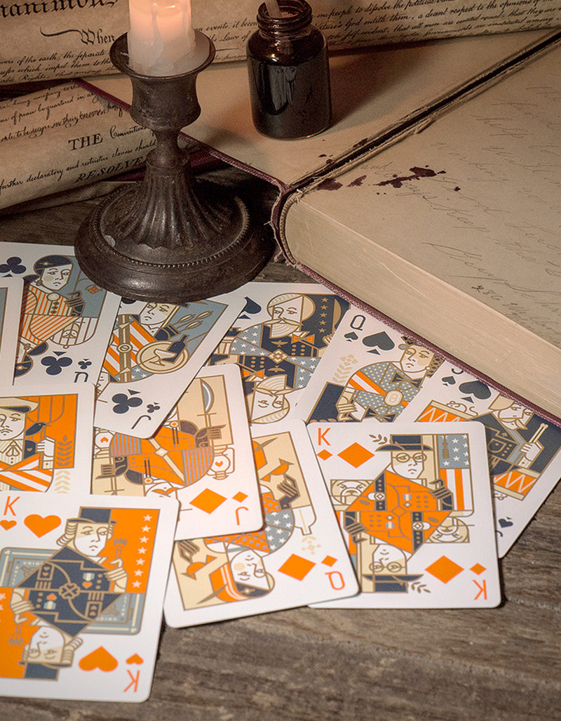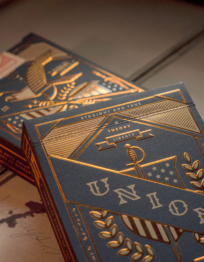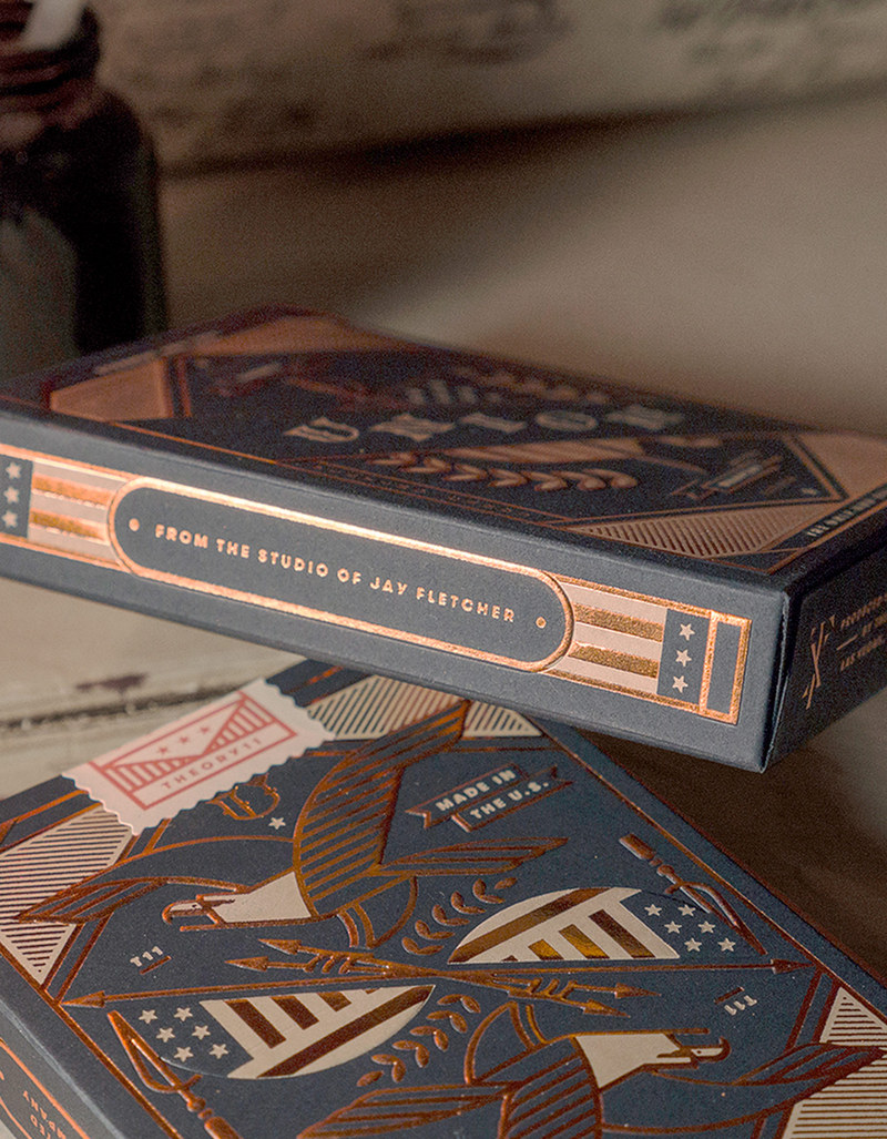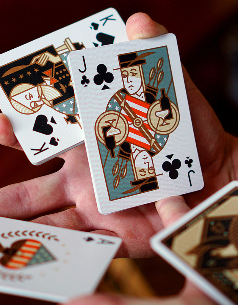 Patriotic playing cards inspired by American history. Union Playing Cards are filled with imagery of the American Revolution - with a message of freedom, hope, and independence. Timeless Americana is laced throughout the design, with iconography of colonial America and patriotic symbols of peace, prosperity, and potential.