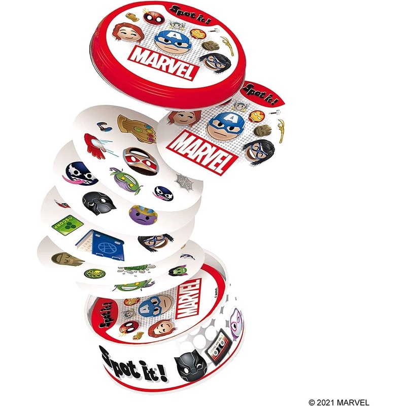 This new version of Spot It! combines different characters from Marvel comics with one of the most emblematic family games. Players try to spot the single matching symbol between two cards in a playful battle of speedy observation. Featuring some of the most iconic Marvel Super Heroes: Iron Man, Captain America, Black Widow!