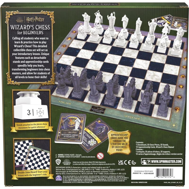 The Harry Potter Chess for Beginners game, produced by Spin Master Games, offers a magical way to learn chess. This set features whimsical designs, including pawns wearing wizard hats and knights riding broomsticks, making it perfect for young fans aged 8 and up.