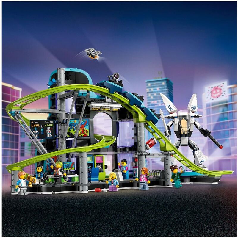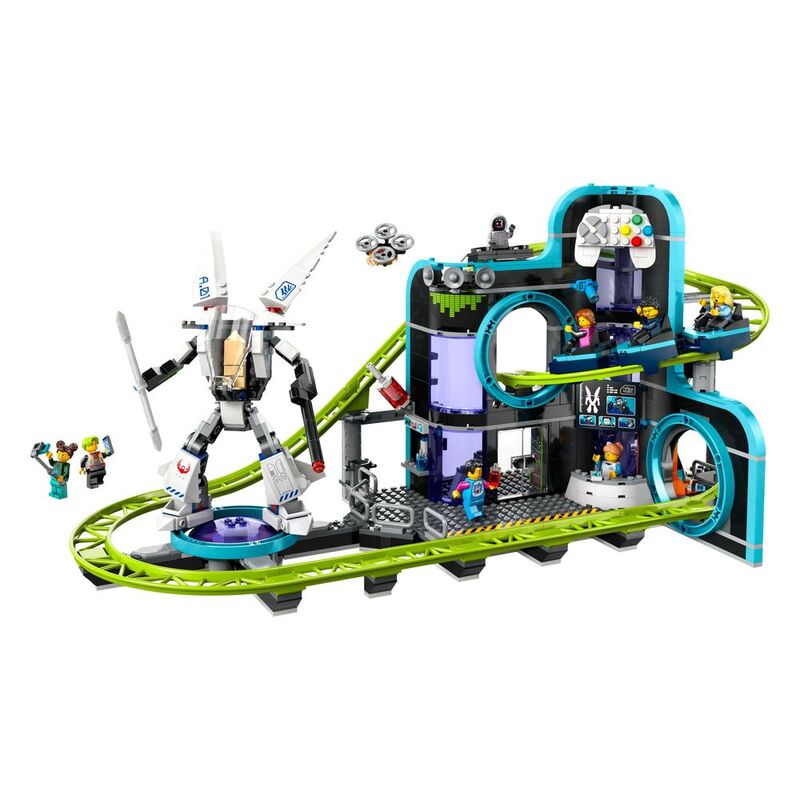 • A building toy packed with details for imaginative play – Features include a working 3-car roller-coaster train, a posable mech with a minifigure seat and toy arcade videgaming consoles