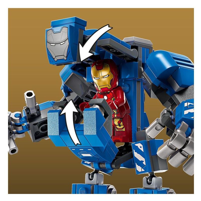 - • Super Hercharacters – MK1, MK43 and MK6 Iron Man armour, Pepper Potts and Aldrich Killian minifigures, a buildable Dum-E robot and an MK3 mech with movable arms and legs and an opening cockpit