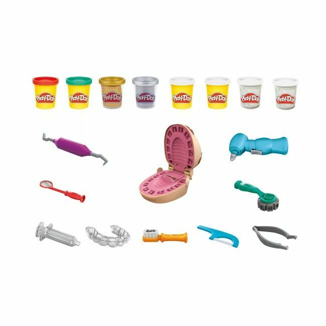 Stick Out Your Tongue and Say "Ahh!" Whether your child likes going to the dentist or not, they'll love pretending to BE the dentist. Kids can make the patient stick out his Play-Doh tongue, make a couple rows of Play-Doh teeth, and start the checkup!Product and colors will vary. Compound not intended to be eaten. Adult assembly required. Notice to Parents: Contains Wheat. Non-Toxic. Conforms to: ASTM D-4236. To clean, allow to dry, then scrape or vacuum. Molded results vary depending on child’s age and level of skill.. DRILL AND FILL PLAY-DOH TEETH: Use the hand-powered spinning toy drill to dig into those cavities, then squeeze Play-Doh fillings from the syringe extruder to fix them right up.