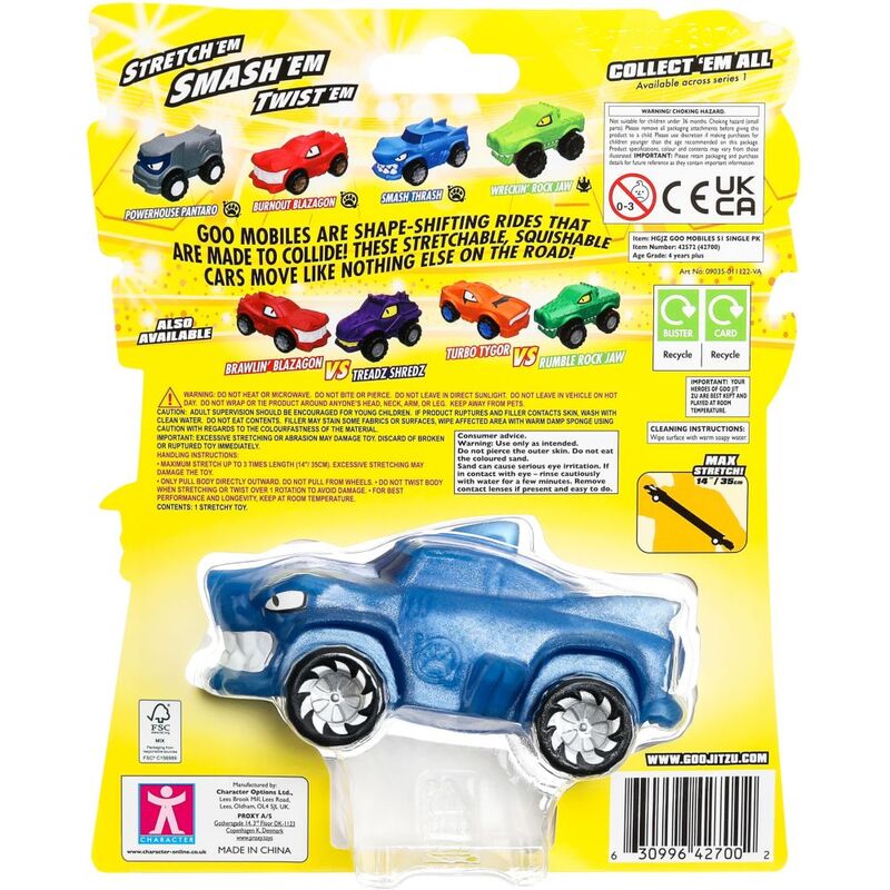 Heroes of Goo Jit Zu Goo Mobiles! Shape Shifting Rides made to collide! These stretchable, squishable cars move like nothing else on the road! Stetch Them! Smash Them! Twist Them! Fix Them and start again! Smash Thrash moves like nothing else! There’s 4 single cars to collect - why not add Powerhouse Pantaro, Smash Thrash or Wreckin’ Rock Jaw to your collection too? A brand new ALL-GOO way to play! Heroes of Goo Jit Zu Goo Mobiles! Goo Yah! Suitable from 4 years.