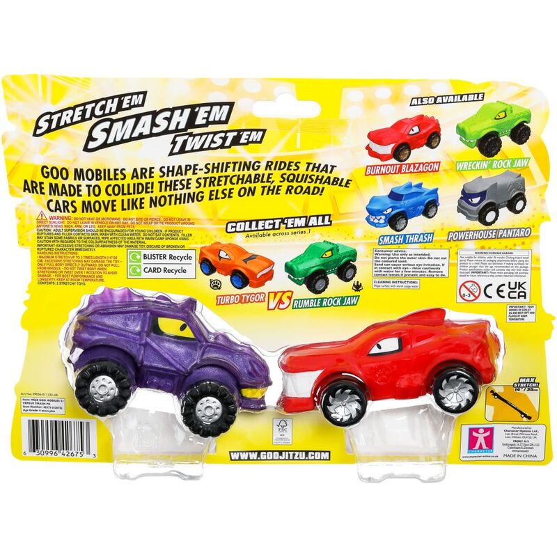 Heroes of Goo Jit Zu Goo Mobiles! Shape Shifting Rides made to collide! These stretchable, squishable cars move like nothing else on the road! Stetch Them! Smash Them! Twist Them! Fix Them and start again! These cars move like nothing else! In this awesome versus twin pack you’ll get an exclusive Brawlin’ Blazagon ready to take on Treadz Shredz! A brand new ALL-GOO way to play! Heroes of Goo Jit Zu Goo Mobiles! Goo Yah! Suitable from 4 years.